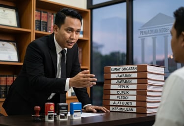 3. Membuat surat gugatan, jawaban, replik, duplik, pledoi, dan memeriksa saksi-saksi menyerahkan bukti-bukti serta kesimpulan dan lain-lain, pada tingkatan Pengadilan Negeri, Pengadilan Hubungan Industrial (PHI), Pengadilan Agama dan Pengadilan Tata Usaha Negara atau Badan Peradilan lainnya yang berlaku di Indonesia.